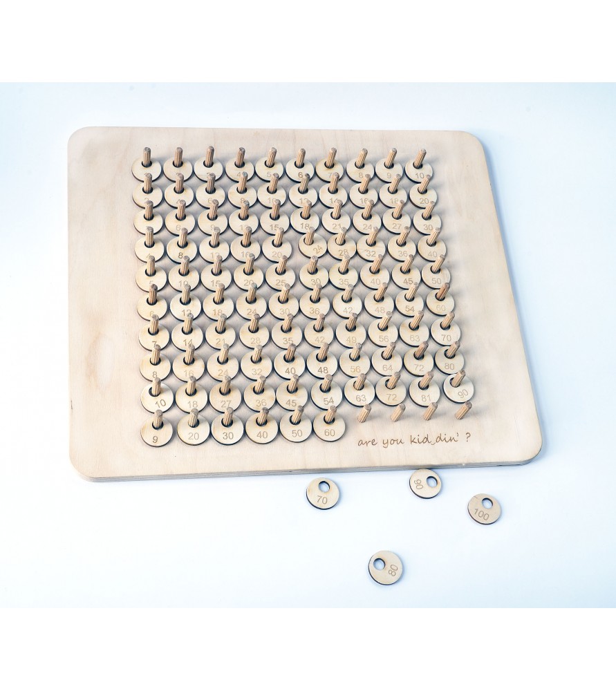Zestaw zawieszek z wygrawerowanymi wynikami mnożenia 1-100 obrazującymi wyniki tabliczki mnożenia.
