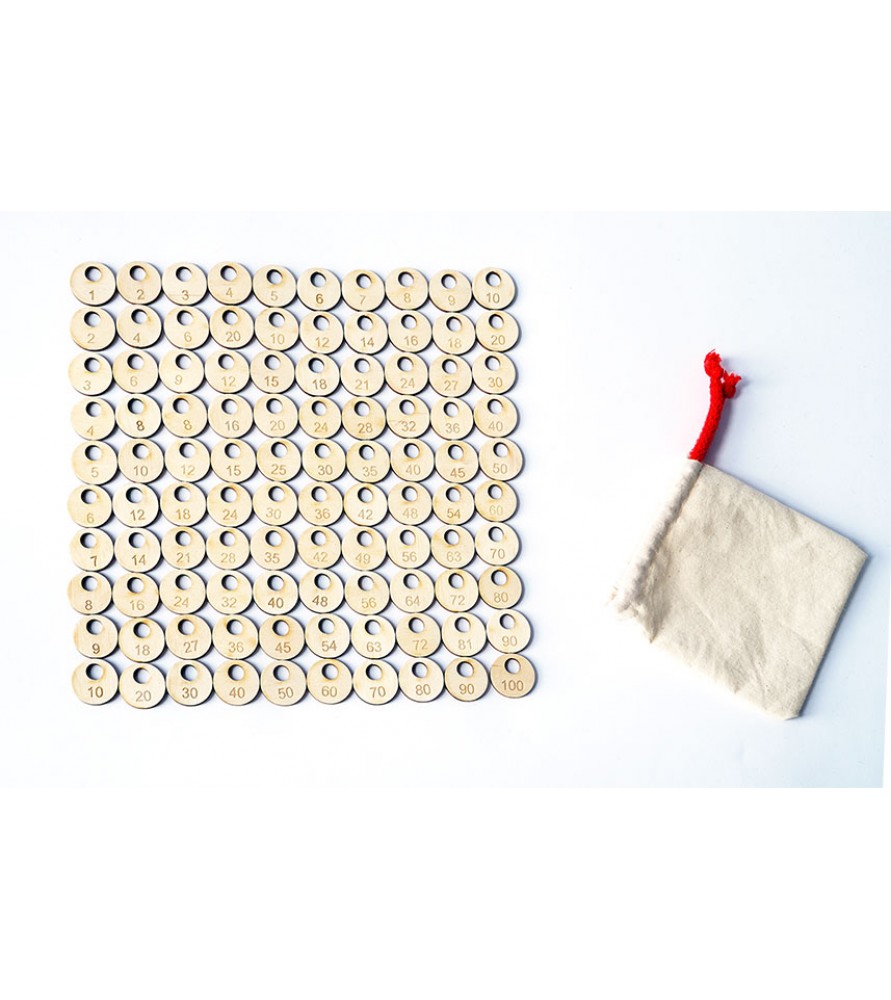 Oferta to zestaw stu grawerowanych kółek ze sklejki w bawełnianym woreczku.